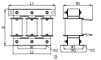電抗器型號(hào) | 匹配電容器規(guī)格 | 電抗器容量 | 電感量(mH) | 外形尺寸L×W×H(mm) | 安裝尺寸(mm) |
